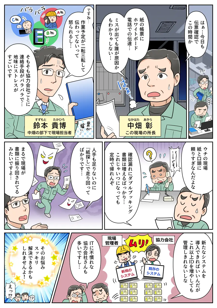 建設現場の業務生産性が低下している背景の一つに、「ペーパーレス化の遅れ」が挙げられます。多くの書類や図面が紙で管理されており、書類作成や情報共有、更新作業に手間がかかっている現場も少なくありません。そのため、現場DXによる業務効率の改善が強く求められています。また、業務が属人化しやすい環境に加え、元請と協力業者間のコミュニケーションミスによる業務の手戻りも多く、ICTツールの導入による生産性向上は依然として課題となっています。